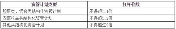 依据新规,股票类、混合类结构化资产管理计划的杠杆倍数规定不得超过1倍,固定收益类结构化资产管理计划的杠杆倍数不得超过3倍,其他类结构化资产管理计划的杠杆倍数超过2倍。